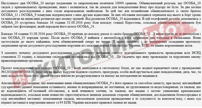 «Обвинувачений ОСОБА_9в суді першої та апеляційної інстанції повідомив, що свою вину у вчиненні інкримінованого йому злочину не визнає, матеріали провадження стосовно нього сфальсифіковані працівниками УСБУ і прокуратури Житомирської області. Детальні показання надав письмово в суді першої інстанції, які фактично підтримав в ході апеляційного розгляду. Згідно письмових показань ОСОБА_9 ні про які кошти з ОСОБА_10 , які пов`язані з непритягненням останнього до кримінальної відповідальності, мови не вів і грошей від нього не вимагав. Останній сам проявив ініціативу надати у борг 10 000 гривень. Після чого працівники УСБУ та прокуратури Житомирської області, використовуючи ОСОБА_10 , організували стосовно нього провокацію злочину. Крім того, вказав на істотні порушення вимог кримінального процесуального кодексу, не відповідність пред`явленого обвинувачення фактичним обставинам, яке обґрунтоване лише суперечливими показаннями заявника ОСОБА_10 , його брата ОСОБА_11 та матеріалами НСРД, які проведено з порушенням норм КПК та його конституційних прав», - йдеться у вироці.
