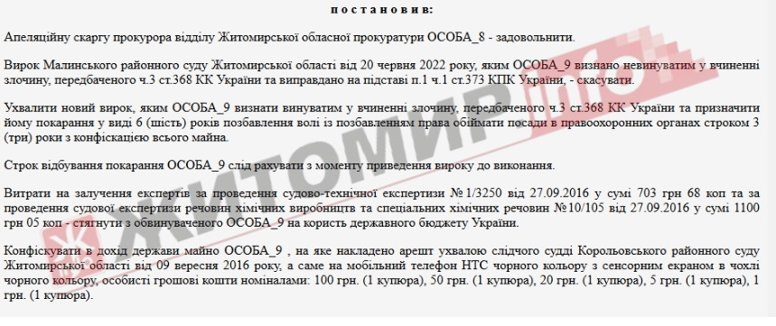 «Прокурор Житомирської обласної прокуратури довів в апеляційній інстанції вину колишнього слідчого поліції у скоєнні корупційного правопорушення – одержанні неправомірної вигоди правоохоронцем, поєднаному з вимаганням (ч. 3 ст. 386 КК України).Житомирський апеляційний суд скасував вирок суду першої інстанції, яким ексслідчого виправдано у скоєнні злочину, визнав його винним та призначив покарання у виді позбавлення волі на 6 років з позбавленням права обіймати посади у правоохоронних органах протягом трьох років, з конфіскацією майна», - йдеться в повідомленні.