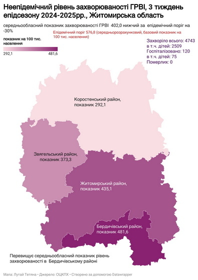 Зауважимо, що відповідно до інфографіки Житомирського обласного центру контролю та профілактики хвороб, минулого тижня на ГРВІ у Житомирській області захворіли 4743 людини. З них 2509 – діти, 120 людей госпіталізовані, до лікарні потрапили 75 дітей.