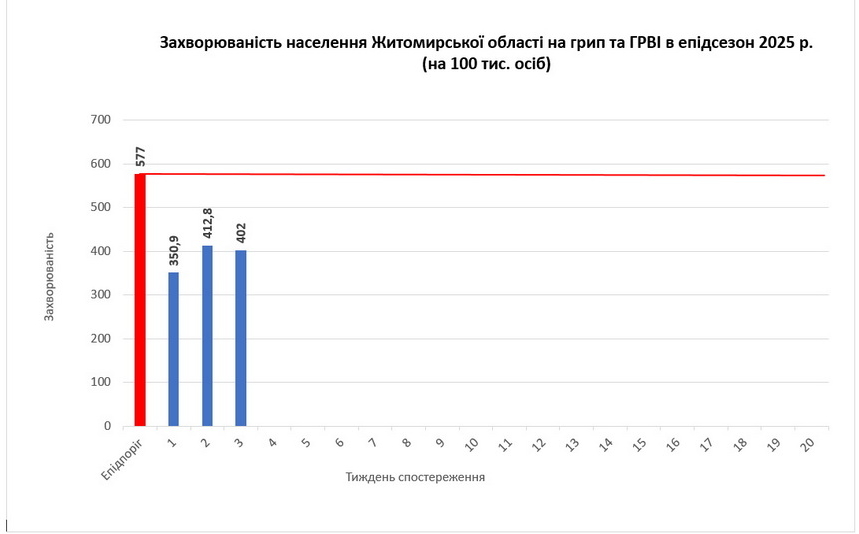 «Незначне зниження захворюваності відбулось як серед дитячого, так і дорослого населення, в усіх районах області. Перевищує середньообласний показник рівень захворюваності в Бердичівському районі. Показник 402,0 на 100 тисяч населення нижчий за епідемічний поріг на 30%. Захворюваність з початку епідсезону 2024/2025 рр. з ГРВІ залишається на неепідемічному рівні», - йдеться в повідомленні.