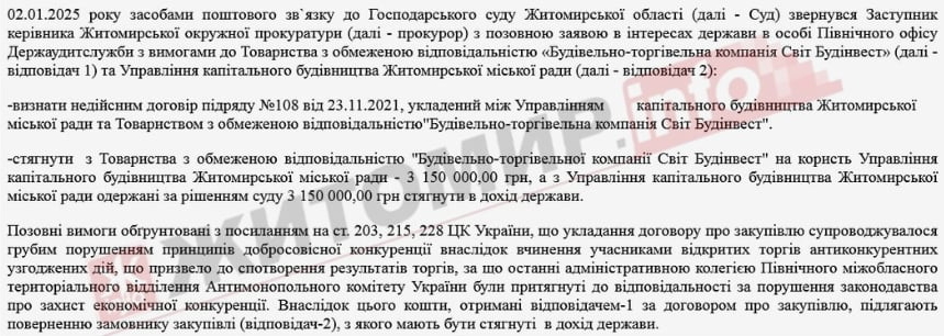 Заступник керівника Житомирської окружної прокуратури 2 січня звернувся до Господарського суду Житомирської області з позовною заявою в інтересах держави в особі Північного офісу Держаудитслужби з вимогами до Товариства з обмеженою відповідальністю «Будівельно-торгівельна компанія Світ Будінвест» та управління капітального будівництва Житомирської міської ради щодо визнання недійсним договору підряду від 23 листопада 2021 року на реконструкцію скверу у Житомирі на проспекті Миру, 9.