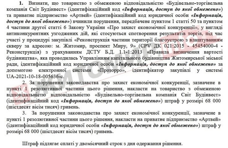 Зокрема, 14 травня 2024 року адміністративна колегія Північного міжобласного територіальне відділення Антимонопольного комітету України ухвалили рішення про те, що ТОВ «Будівельно-торгівельна компанія Світ Будінвест» та приватне підприємство «Артвей» вчинили порушення, передбачене пунктом 1 статті 50 та пунктом 4 частини другої статті 6 Закону України «Про захист економічної конкуренції», у вигляді антиконкурентних узгоджених дій, які стосуються спотворення результатів торгів, під час участі у процедурі закупівлі «Реконструкція частини території благоустрою з влаштуванням скверу за адресою: м. Житомир, проспект Миру, 9». За замову на торгах обидві фірми мають сплатити штрафи – по 68 тис. грн кожна.