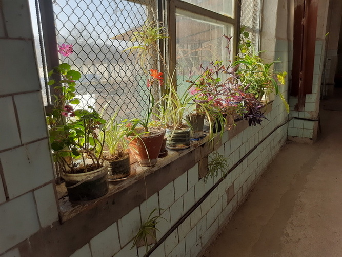 Горщики з квітами на вікнах у приміщенні каналізаційної станції. Фото Олени Кущенко