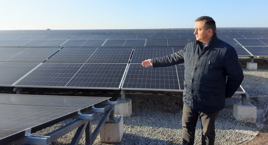 Директор водоканалу Роман Ілик показує сонячні панелі. Фото Олени Кущенко