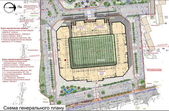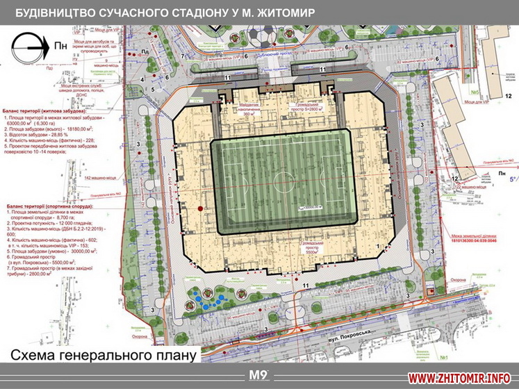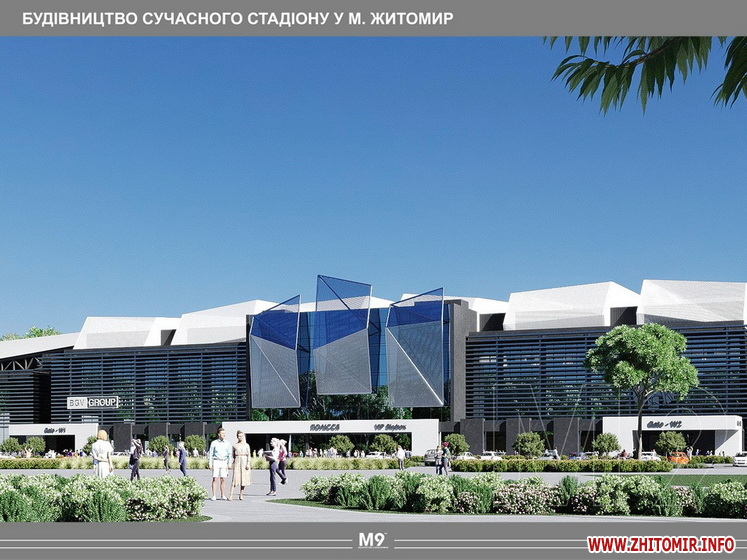 На плані видно, що майбутній стадіон знаходиться на вулиці Покровській (див. фото нижче), на фасаді стадіону є напис «BGV Group» – назва компанії, засновником якої є Геннадій Буткевич, та логотип і назва місцевого ФК «Полісся».