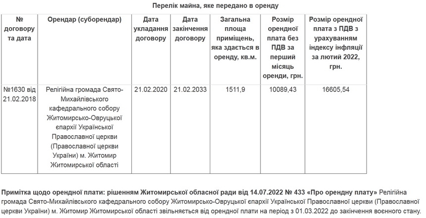 Зауважимо, на сайті облради є інформація, що весь комплекс будівель загальною площею 1511,9 кв.м орендує релігійна громада Свято-Михайлівського кафедрального собору. Договір оренди діє до 21 лютого 2033 року, з 1 березня 2022 року релігійна громада звільнення від орендної плати. Інформація про те, що об’єкт знаходиться в довгостроковій оренді, в документах до аукціону відсутня.