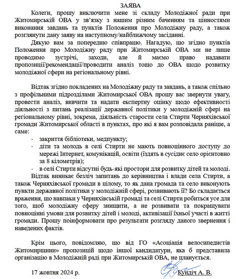 «Прошу виключити мене зі складу Молодіжної ради при Житомирській ОВА у зв’язку з нашим різним баченням та цінностями виконання завдань та пунктів Положення про Молодіжну раду, а також розглянути дану заяву на наступному/найближчому засіданні. Нагадую, що згідно пунктів Положення про Молодіжну раду при Житомирській ОВА ми не лише проводимо зустрічі, заходи, але й маємо право надавати пропозиції/рекомендації/проводити аналіз тощо до ОВА щодо розвитку молодіжної сфери на регіональному рівні. Відтак згідно покладених на Молодіжну раду та завдань, а також спільно з профільними підрозділами Житомирської ОВА прошу вас звернути увагу, провести аналіз, вивчити та надати експертну оцінку щодо ефективності діяльності з питань реалізації державної політики у молодіжній сфері на регіональному рівні, зокрема, діяльність старости села Стирти Черняхівської громади Житомирської області в пунктах, про які я вам розповідала раніше», - йдеться в оприлюдненій заяві Аліни Кундіч (див. скриншот).