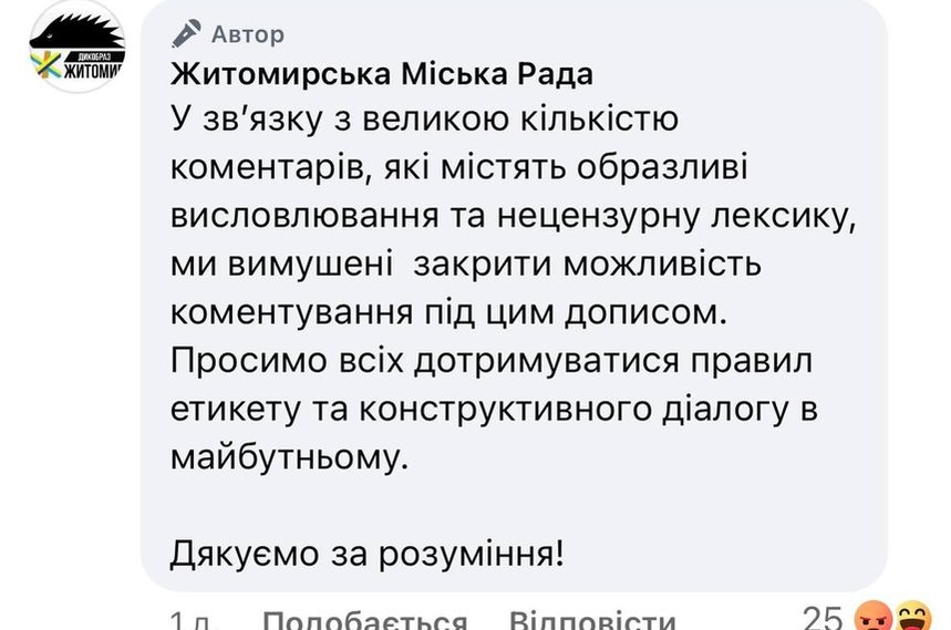 На офіційній сторінці у Фейсбук Житомирської міської ради прибрали можливість коментувати цю новину, мовляв, через велику кількість образливих висловлювань та нецензурної лексики.