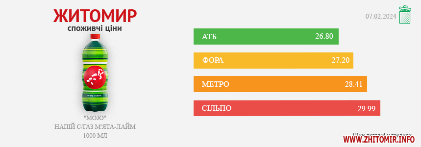 Моніторинг здійснено на основі інформації, отриманої за методом контрольної закупки 07.02.2025 р. у місцях продажу: АТБ, пр. Миру, 15 А, Фора, вул. Лятошинського, 2, Метро, вул. Ватутіна, 55-в, Сільпо, вул. Житній ринок, 1