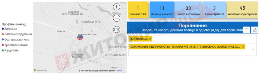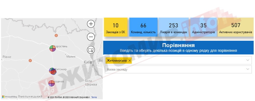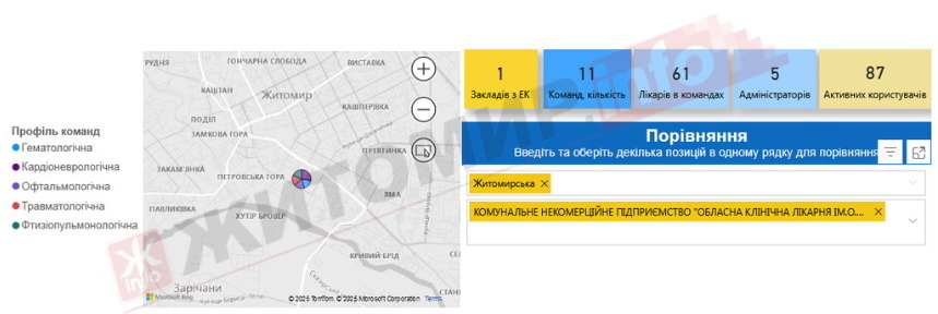 У Житомирській області є 66 експертних команд, які працюють у 10 закладах, найбільше експертних команд (по 11) є у двох закладах – КНП «Обласна клінічна лікарня ім.О.Ф.Гербачевського» та КНП «Лікарня №2 ім.В.П.Павлусенка» Житомирської міської ради.