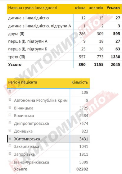У дашборді зазначено, що у Житомирській області до експертних команд направили справи 3431 людини з них 2045 мають інвалідність, найбільше ІІІ група – 1330 осіб.