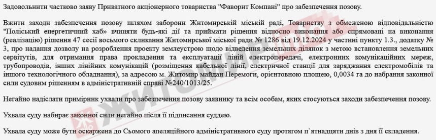 Зауважимо, що ухвалою від 6 лютого 2025 року Житомирський окружний адміністративний суд відкрив провадження за позовом ПрАТ «Фаворит Компані» до Житомирської міської ради та ТОВ «Поліський енергетичний хаб» про визнання протиправним та скасування рішення сесії міської ради від 19.12.2024 в частині надання дозвіл на розроблення проєкту землеустрою щодо відведення земельних ділянок з метою встановлення земельних сервітутів, для отримання права прокладення та експлуатації ліній електропередачі, електронних комунікаційних мереж, трубопроводів, інших лінійних комунікацій (розміщення кабельної лінії, електричної станції для заряджання електромобілів та іншого технологічного обладнання), за адресою: м. Житомир, майдан Перемоги, орієнтовною площею, 0,0034 га ТОВ «Поліський енергетичний хаб».