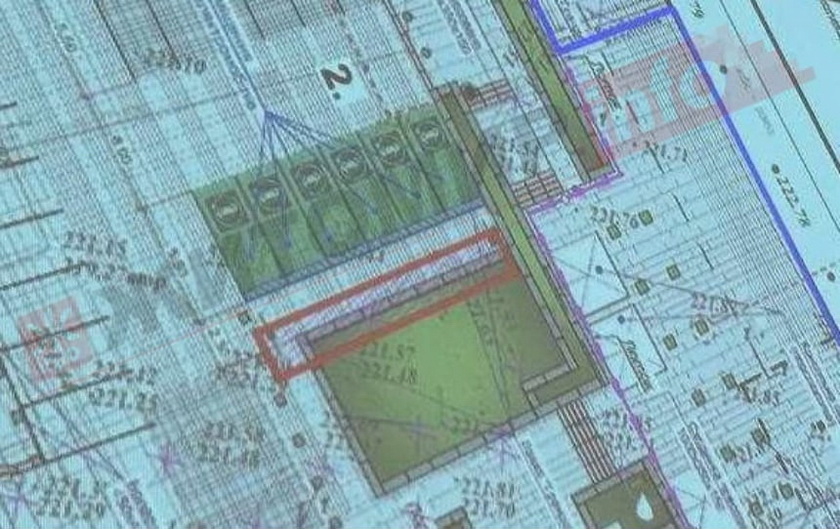 Ігор Блажиєвський повідомив, що з геодезистом ретельно пропрацювали місце розташування сформованої земельної ділянки (виділена червоним) – 15 метрів довжиною і 2,26 метра шириною, а місце, де хоче розмістити зарядні станції «Фаворит Компані» знаходиться поряд (сині промені). Після цього члени виконкому проголосували за надання дозволу «Фаворит Компані» на встановлення електрозаправки. Нижче – схема, яку показували на засіданні виконкому:
