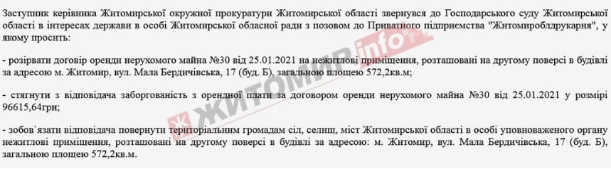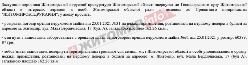 Водночас прокуратура звернулася до суду з позовом про до ПП «Житомироблдрукарня» щодо розірвання договір оренди нерухомого майна від 25.01.2021 на нежилі приміщення площею 162,26 кв.м, розташовані на першому поверсі в іншій будівлі на вул. Мала Бердичівська, 17 та стягнення заборгованої орендної плати у розмірі 60 тис. 389, 87 грн. Провадження відкрите і судовий розгляд призначений на 19 березня 2025 року.