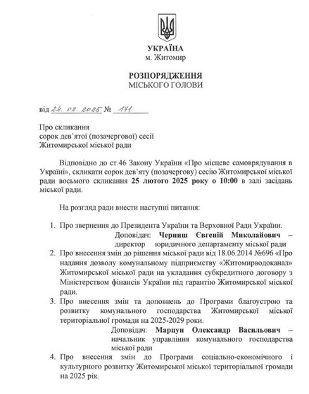 «25 лютого 2025 року о 10:00 відбудеться 49 (позачергова) сесія Житомирської міської ради восьмого скликання. Відповідне розпорядження підписала секретар міської ради Галина Шиманська. На порядку денному - 5 питань», - йдеться в повідомленні.