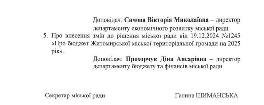 - Про внесення змін до рішення міської ради від 19.12.2024 №1245 «Про бюджет Житомирської міської територіальної громади на 2025 рік».