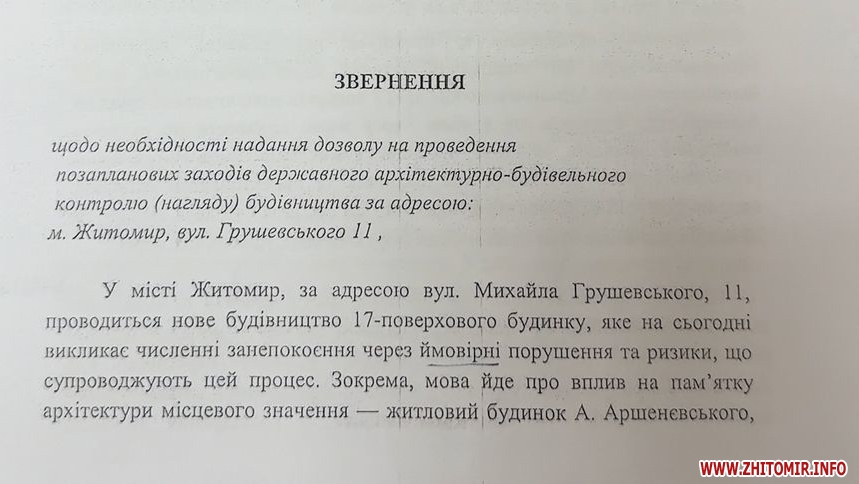 «Заявниця описує ситуацію: у Житомирі за адресою вул. Михайла Грушевського, 11 проводиться нове будівництво 17-поверхового будинку, яке наразі викликає численні занепокоєння через ймовірні порушення та ризики, що супроводжують цей процес», – сказав заступник начальника управління державного архітектурно-будівельного контролю Житомирської міської ради Олександр Щур.