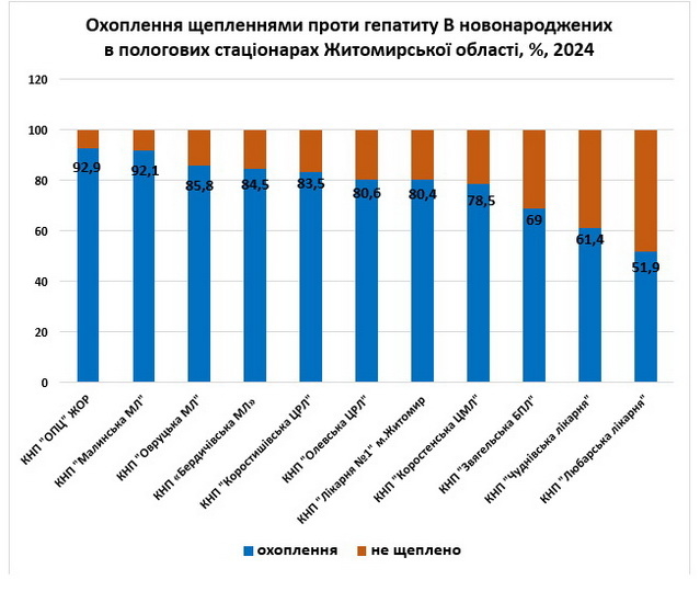 За дванадцять місяців 2024 року в Житомирській області народилось 6 323 дитини, з них проти гепатиту В в пологових стаціонарах вакциновано 5 255 новонароджених, що складає 83,1% при рекомендованому рівні 95%.