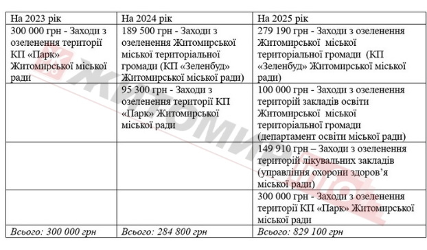 «У порівнянні з 2023 роком сума на озеленення була нижчою на 5,6%. Однак у 2024 заплановано фінансування заходів з озеленення на 2025 рік з фонду ОНПС у сумі 829 100 грн, що більше на 191% в порівнянні з 2024 роком. Також розпорядниками коштів обрано КП «Парк» Житомирської міської ради, КП «Зеленбуд» Житомирської міської ради, департамент освіти міської ради та управління охорони здоров’я міської ради», - йдеться в проєкті рішення.