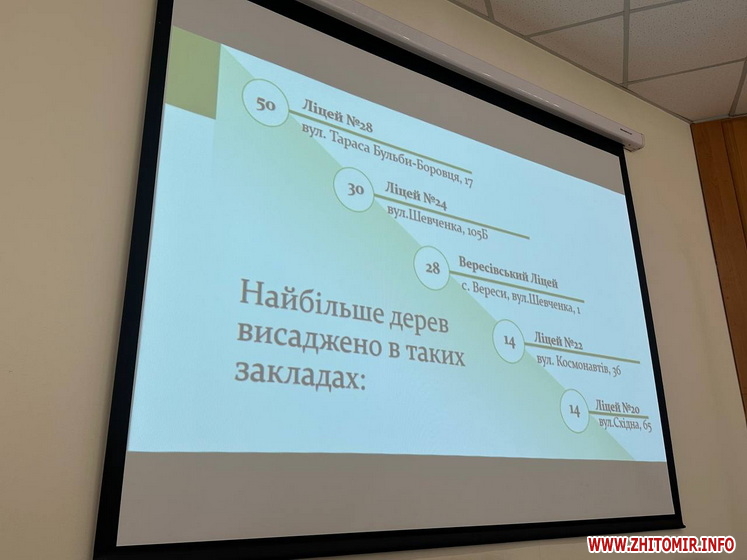 «Найбільше дерев висаджено в таких закладах: ліцей № 28 міста Житомира імені гетьмана Івана Виговського (50), ліцей №24 міста Житомира (30), Вересівський ліцей Житомирської міської ради (28), ліцей №22 міста Житомира імені Василя Михайловича Кавуна (14), ліцей №20 міста Житомира (14).Висаджено дерева таких порід: катальпи, туї, ялини, верби, берези, сакури, сумах, горобини, клени, калини, фруктові дерева, сосни, модрини, дерен на штамбі, горіхи, липи», - йдеться в проєкті рішення.