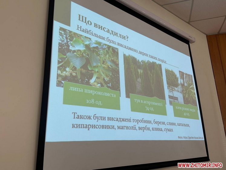 «Комунальне підприємство «Зеленбуд» Житомирської міської ради протягом 2024 року висадило 275 дерев та 1073 кущі. Найбільше було висаджено дерев таких порід: 108 лип широколистих, 74 туї, 41 клен різних видів. Також були висаджені горобини, берези, сливи, катальпи, кипарисовики, магнолії, верби, ялина, сумах», - розповіла начальниця відділу екології та природних ресурсів міської ради Поліна Мурашевська.
