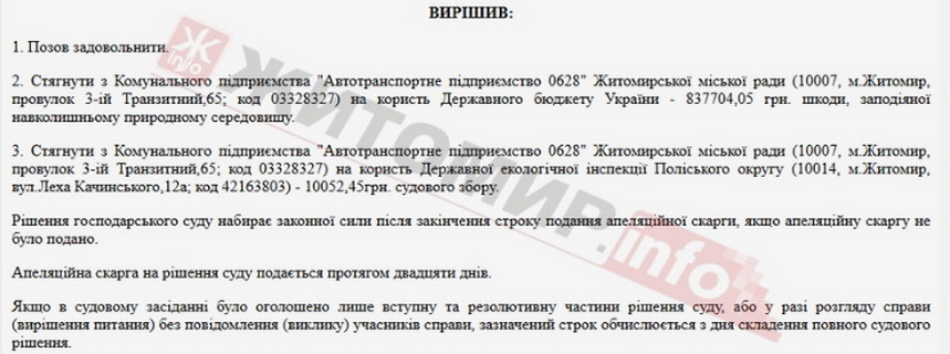 Суд прийняв рішення стягнути з КП «Автотранспортне підприємство 0628» Житомирської міськради 838 704,05 грн шкоди, заподіяної навколишньому природному середовищу.
