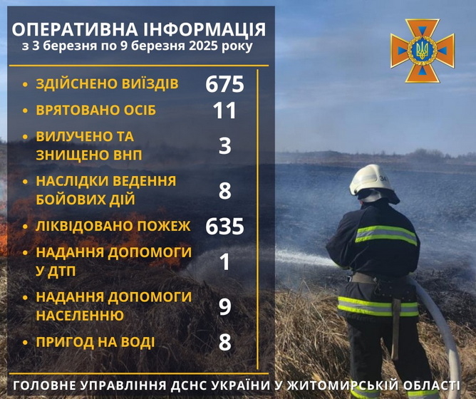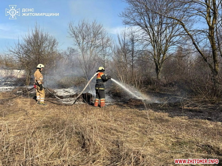 Як повідомляв Житомир.info, 6 березня 2025 року в Житомирській області сталися 116 пожеж в екосистемах, зокрема, у Коростенському районі вогнеборці ліквідували загоряння сухої трави, що поширилося на занедбані споруди: вогонь знищив 7 споруд та 2,9 га сухої трави. Наступного дня, 7 березня, було 108 пожеж, вогнем пройдено понад 138 га, зокрема, 4 години гасили майже 3 га сухостою у селі с. Новий Любар Житомирського району.