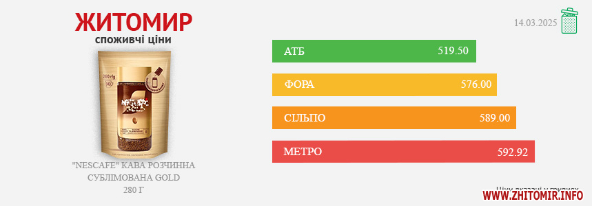 Моніторинг здійснено на основі інформації, отриманої за методом контрольної закупки 14.03.2025 р. у місцях продажу: АТБ, пр. Миру, 15 А, Фора, вул. Лятошинського, 2, Метро, вул. Ватутіна, 55-в, Сільпо, вул. Житній ринок, 1