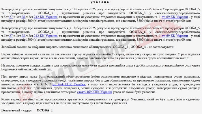 «Бердичівський суд затвердив угоду про визнання винуватості між прокурором та двома бердичівлянками, обвинуваченими у пособництві порушенню правил охорони вод (водних об'єктів), що спричинило забруднення поверхневих вод, створило небезпеку для довкілля та спричинило тяжкі наслідки, вчиненому організованою групою осіб (ч. 5 ст. 27, ч. 3 ст. 28, ч. 2 ст. 242 КК України). Суд призначив обом жінкам узгоджене сторонами покарання – штраф у розмірі 8 500 грн кожній. Вирок ще не набув чинності та може бути оскаржений», - йдеться в повідомленні.
