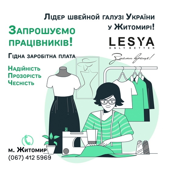 При успішно пройденому курсі – працевлаштування на фабриці LESYA, де ви будете отримувати гідну оплату праці та соціальний пакет, харчування за пільговими цінами, доставка до роботи за рахунок підприємства, медичне обслуговування тощо