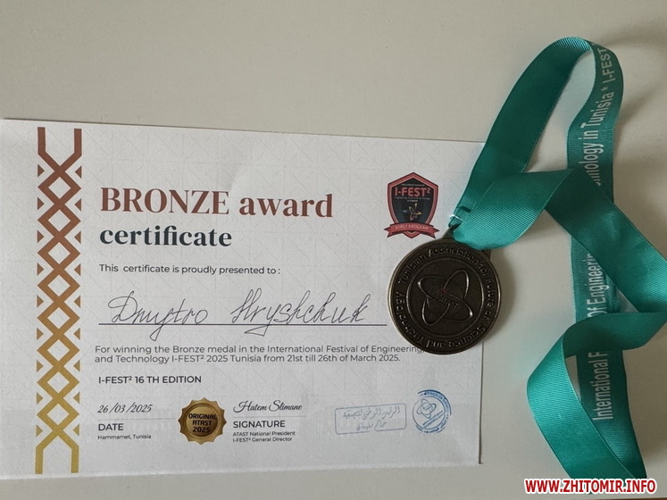«Департамент освіти Житомирської міської ради вітає переможців Міжнародного фестивалю інженерії, науки та технологій «I-FEST» (International Festival of Engineering Science and Technology in Tunisia). Фестиваль відбувався з 21 по 27 березня 2025 року у місті Хаммамет, Туніська Республіка та об’єднав 1200 юних науковців із 40 країн світу. Україну представляли 30 хлопців та дівчат з 14 областей. Вони вибороли 31 нагороду: 4 золотих, 8 срібних, 12 бронзових медалей та 6 почесних відзнак і 1 за топпроєкт», - йдеться в повідомленні.