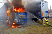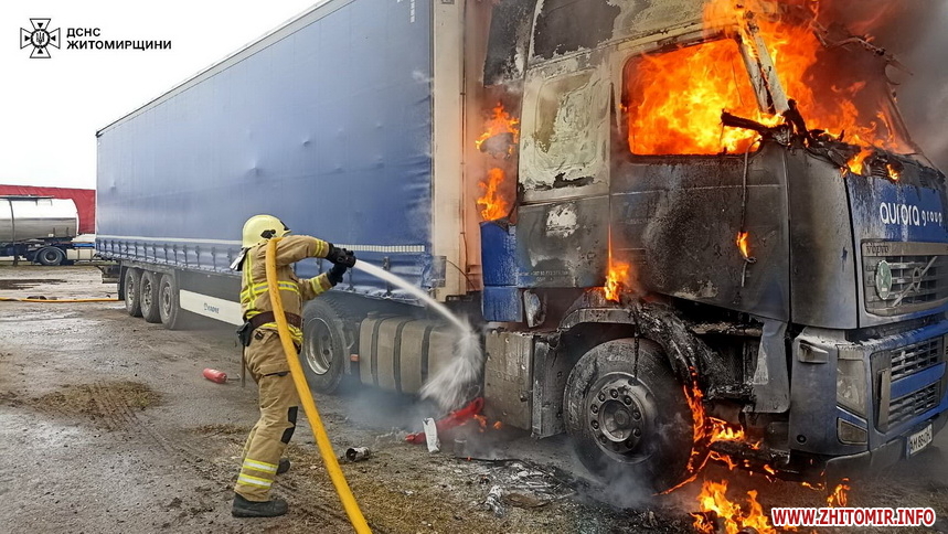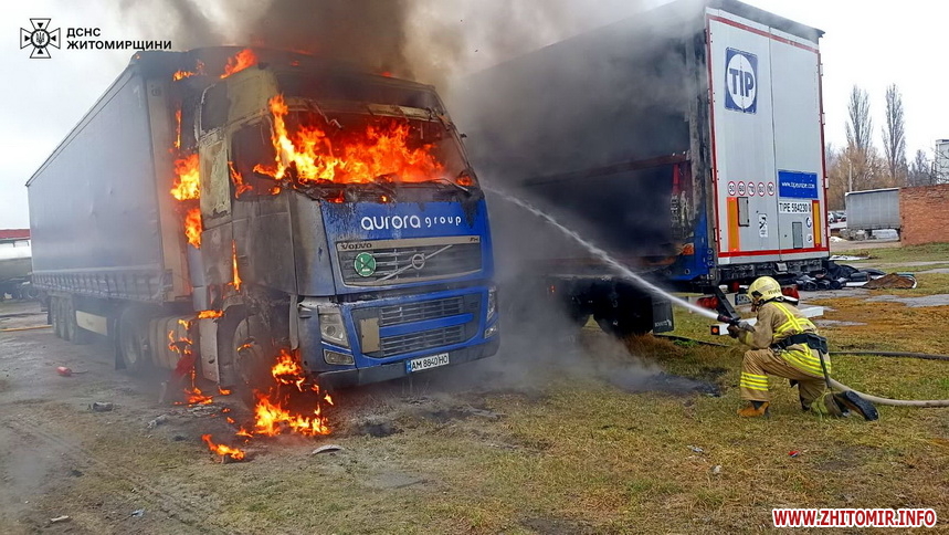 «1 квітня о 10:07 до Служби порятунку «101» надійшло повідомлення про займання вантажного автомобіля VOLVO у м. Житомир. На місці події бійці ДСНС встановили, що вогнем охоплена кабіна вантажного автомобіля та існує загроза поширення полум’я на розташовану поблизу ще одну вантажівку. Силами бійців ДСНС о 10:35 пожежу ліквідовано. Вогонь устиг знищити кабіну зазначеного вантажного автомобіля та пошкодити причіп сусідньої вантажівки. Подальшого розповсюдження вогню рятувальникам вдалось не допустити», - йдеться в повідомленні.