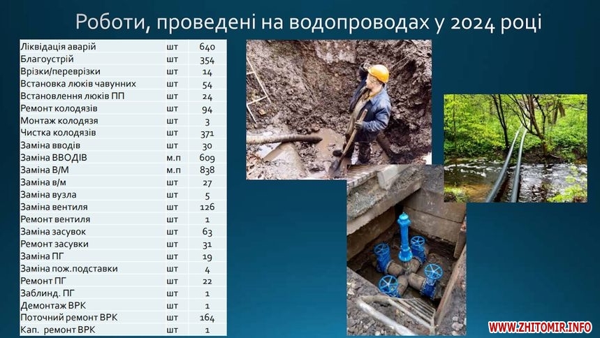 Як повідомляв Житомир.info, загальна протяжність мережі водопостачання міста становить 529,1 км, з яких 323,4 км (61,1%) перебувають у зношеному стані. Упродовж 2024 року комунальним підприємством «Житомирводоканал» замінено 2217 пог. м вуличних водопровідних мереж та вводів до житлових багатоквартирних будинків, 496 пог. м зношених водопровідних трубопроводів.