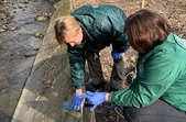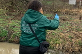 Екоінспектор відібрав проби води з рівчака для проведення дослідження.