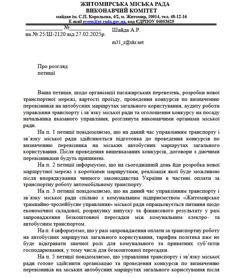 Влада відповіла на петицію з вимогою не допустити шантажу громади з боку приватних перевізників та реформувати систему громадського транспорту Житомира.