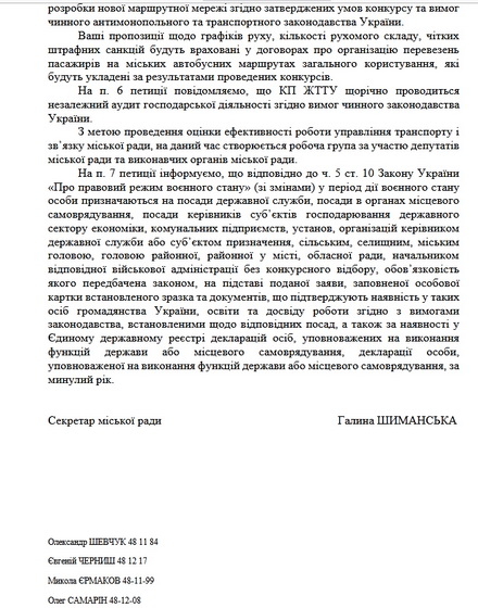 У зверненні було сім пунктів і у відповіді за підписом секретаря міської ради Галини Шиманської є відповідь на кожен з них: