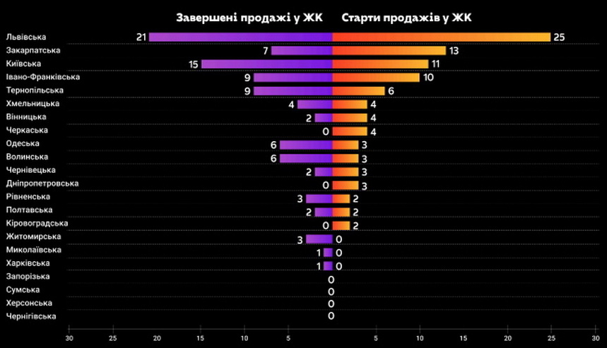 В Україні за пів року продажі завершились у 91 ЖК, що на рівні із кількістю нових ЖК, які розпочали продажі. У Житомирі 3 завершені продажі у, а стартів - 0.