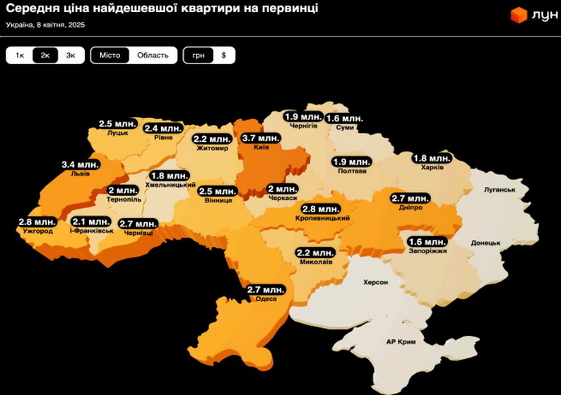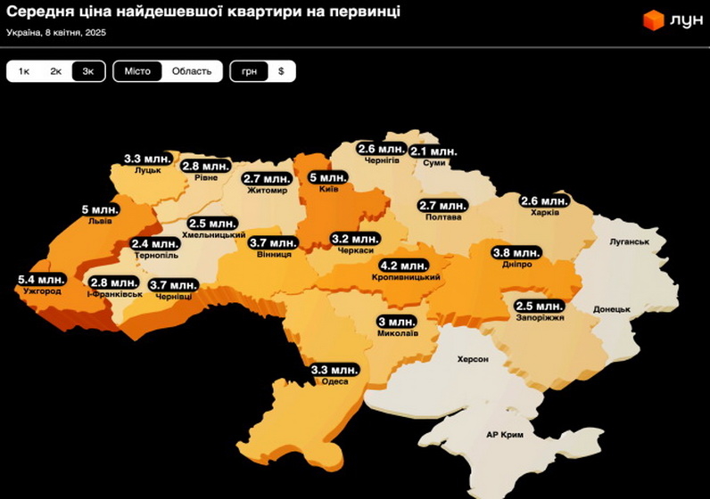 За дослідженням експертів ЛУН, за перший квартал 2025 року в Україні середня вартість готових квартир зростає, але трійка міст-лідерів з найдорожчою нерухомістю лишається незмінною. Ужгород швидко наздоганяє Львів та Київ по середній ціні квартир, а Хмельницький, Тернопіль та Івано-Франківськ зберігають найнижчу вартість житла серед умовно-безпечних регіонів країни. Попри загальне зростання цін, в більшості регіонів України індекс доступності житла стає більш сприятливим – співвідношення середньої вартості квартир та рівня середньої зарплати знижується.