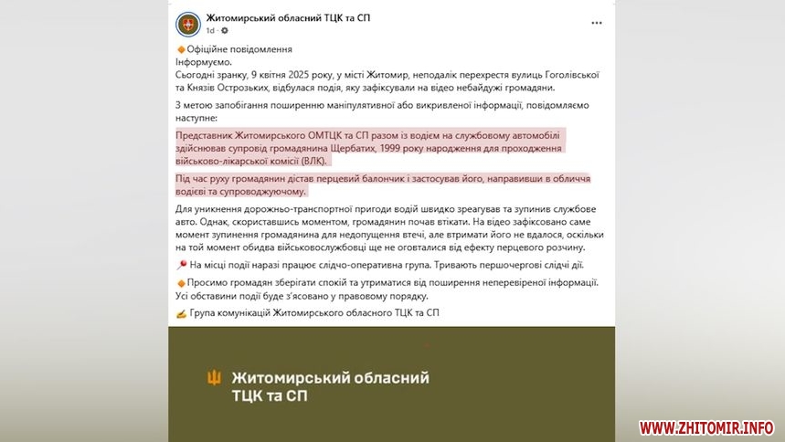 Зранку, 9 квітня, в мережі поширили відео, як у Житомирі працівники ТЦК та СП затримують чоловіка. Згодом з'явився офіційний коментар обласного ТЦК, в якому заявляють: чоловіка супроводжували для проходження ВЛК, а той застосував балончик із перцевим газом, після чого спробував втекти, і йому це вдалося.