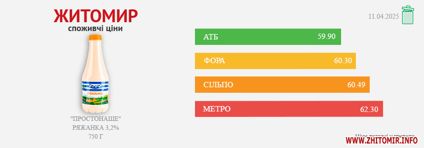 Моніторинг здійснено на основі інформації, отриманої за методом контрольної закупки 11.04.2025 р. у місцях продажу: АТБ, пр. Миру, 15 А, Фора, вул. Київська, 106, Метро, вул. Ватутіна, 55-в, Сільпо, вул. Житній ринок, 1
