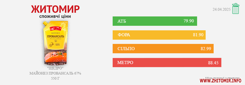 Моніторинг здійснено на основі інформації, отриманої за методом контрольної закупки 24.04.2025 р. у місцях продажу: АТБ, пр. Миру, 15 А, Фора, вул. Київська, 106, Метро, вул. Ватутіна, 55-в, Сільпо, вул. Житній ринок, 1