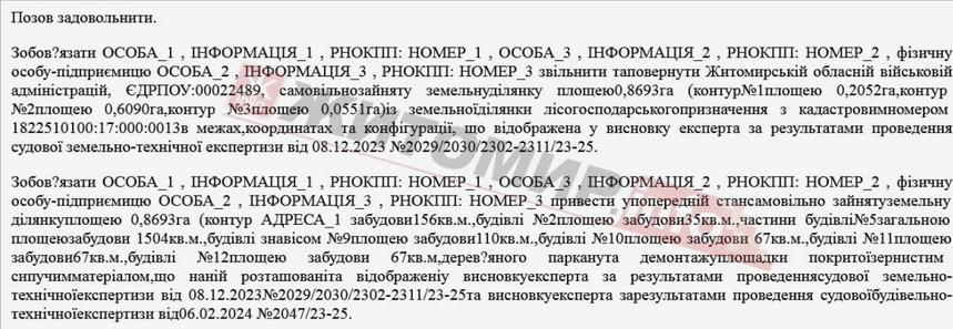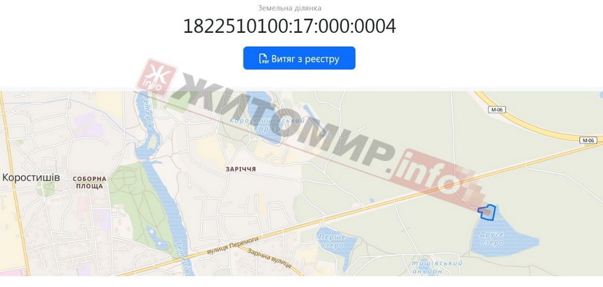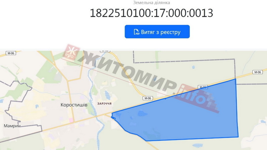 В рішення суду мова йде про частину ділянки біля Коростишева неподалік траси Київ-Чоп (див. скриншот з Опендатабот).