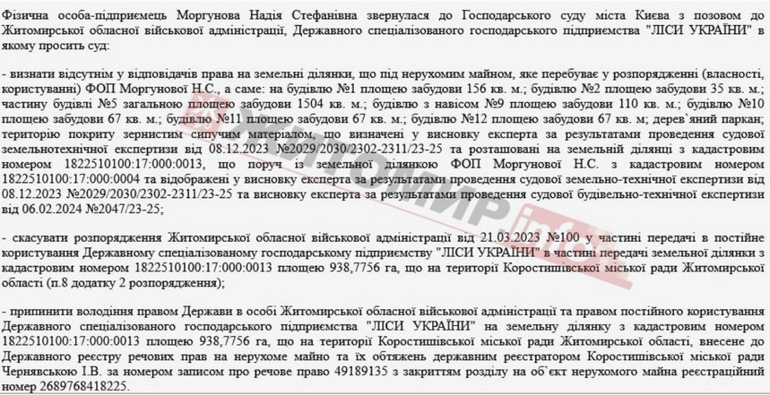 Водночас в січні 2025 року Надія Моргунова звернулася до Господарського суду міста Києва із позовом до Житомирської обласної військової адміністрації та Державного спеціалізованого господарського підприємства «Ліси України» про визнання відсутнім права на земельні ділянки, скасування розпорядження, припинення володіння правом держави в особі Житомирської обласної військової адміністрації та правом ДП «Ліси України» постійного користування земельною ділянкою. У позові йдеться про ділянку з кадастровим номером 1822510100:17:000:0013 площею 938,7756 га на території Коростишівської міської ради. Ухвалою від 20 лютого 2025 року суд зупинив провадження у справі до набрання законної сили рішенням про знесення незаконних споруд на самовільно зайнятій ділянці площею 0,8693 га. На цю ухвалу ФОП Моргунова подала апеляційну скаргу, розгляд якої Північний апеляційний господарський суд почав 2 квітня 2025 року.