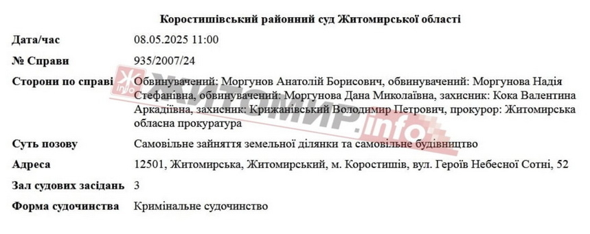 Крім того, з липня 2024 року у Коростишівському районному суді перебуває ще одна справа за кримінальним провадженням від 30 серпня 2023 року про самовільне зайняття земельної ділянки родиною Моргунових, чергове засідання у кримінальній справі за ст. 197-1 КК України (Самовільне зайняття земельної ділянки та самовільне будівництво, яка стосується) призначене на 8 травня 2025 року.