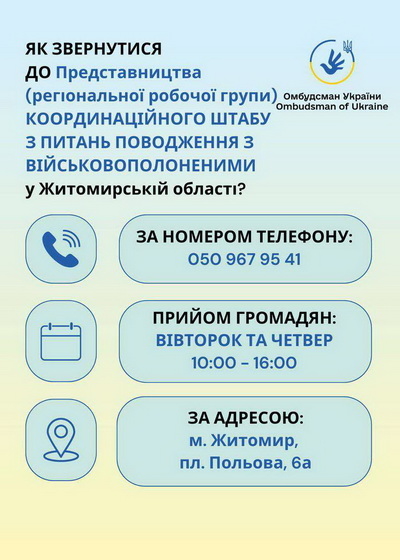 На виконання рішення Ради Координаційного штабу з питань поводження з військовополоненими з 1 травня 2025 року у Житомирі на базі регіонального представництва Уповноваженого Верховної Ради України з прав людини розпочала роботу регіональна робоча група Координаційного штабу, прийом громадян відбуватиметься два рази на тиждень.