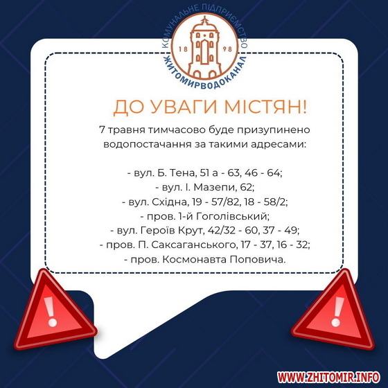 Про це 6 травня повідомляє КП «Житомирводоканал».