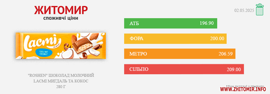 Моніторинг здійснено на основі інформації, отриманої за методом контрольної закупки 02.05.2025 р. у місцях продажу: АТБ, пр. Миру, 15 А, Фора, вул. Київська, 106, Метро, вул. Ватутіна, 55-в, Сільпо, вул. Житній ринок, 1