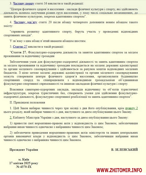 «Президент України Володимир Зеленський підписав Закон України №4370-IX «Про внесення змін до Закону України «Про фізичну культуру і спорт» щодо адаптивного спорту». Цей важливий крок відкриває нові можливості для участі в спортивному житті для осіб з інвалідністю та людей з обмеженням повсякденного функціонування - насамперед, ветеранів війни», - йдеться в повідомленні.