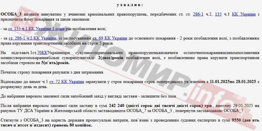Водію, який, перебуваючи за кермом у нетверезому стані, 10 січня 2025 року на Мальованці у Житомирі збив пішохода і поїхав геть, суд призначив покарання.