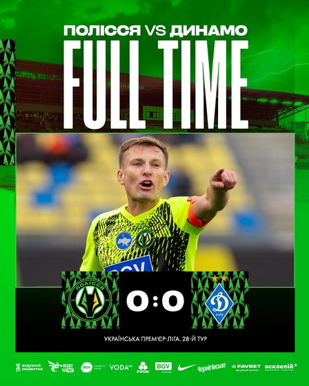 «Полісся — Динамо. Українська Прем'єр-ліга, 28-й тур / Огляд матчу. «Полісся» зіграло внічию з «Динамо» у матчі 28-го туру Чемпіонату України. Гра завершилась з рахунком 0:0», - зазначили у публікації.